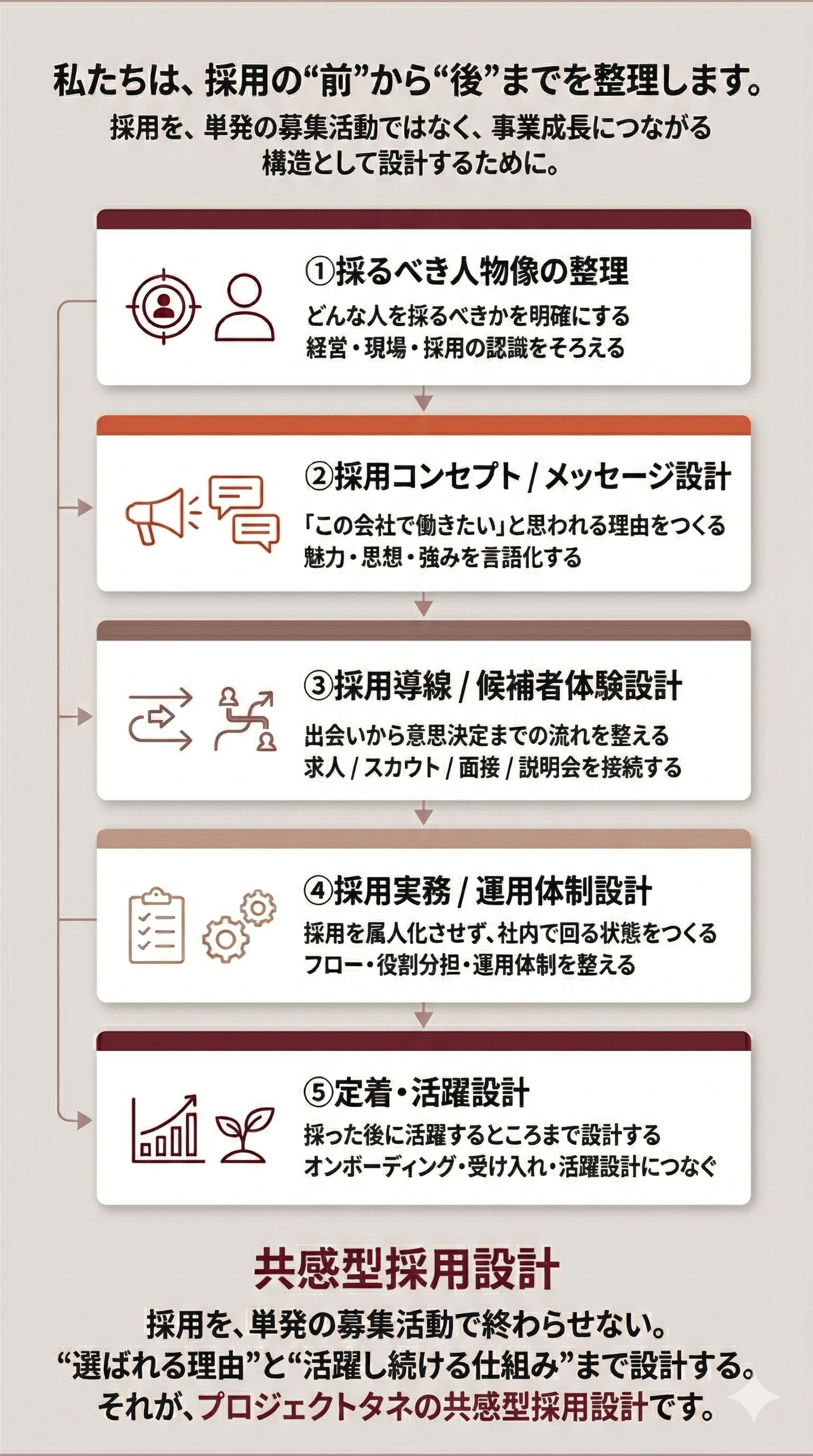 プロジェクトタネでは、採用広報や媒体運用だけではなく、人物像・メッセージ・導線・体制・定着までを一体で見直すことで、企業ごとの採用構造を整える支援を行っています。