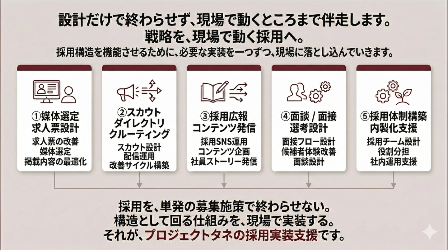 プロジェクトタネでは、採用コンセプトや採用導線を設計して終わるのではなく、採用実務・採用広報・媒体運用・選考設計・内製化支援まで、現場で回るところまで伴走します。