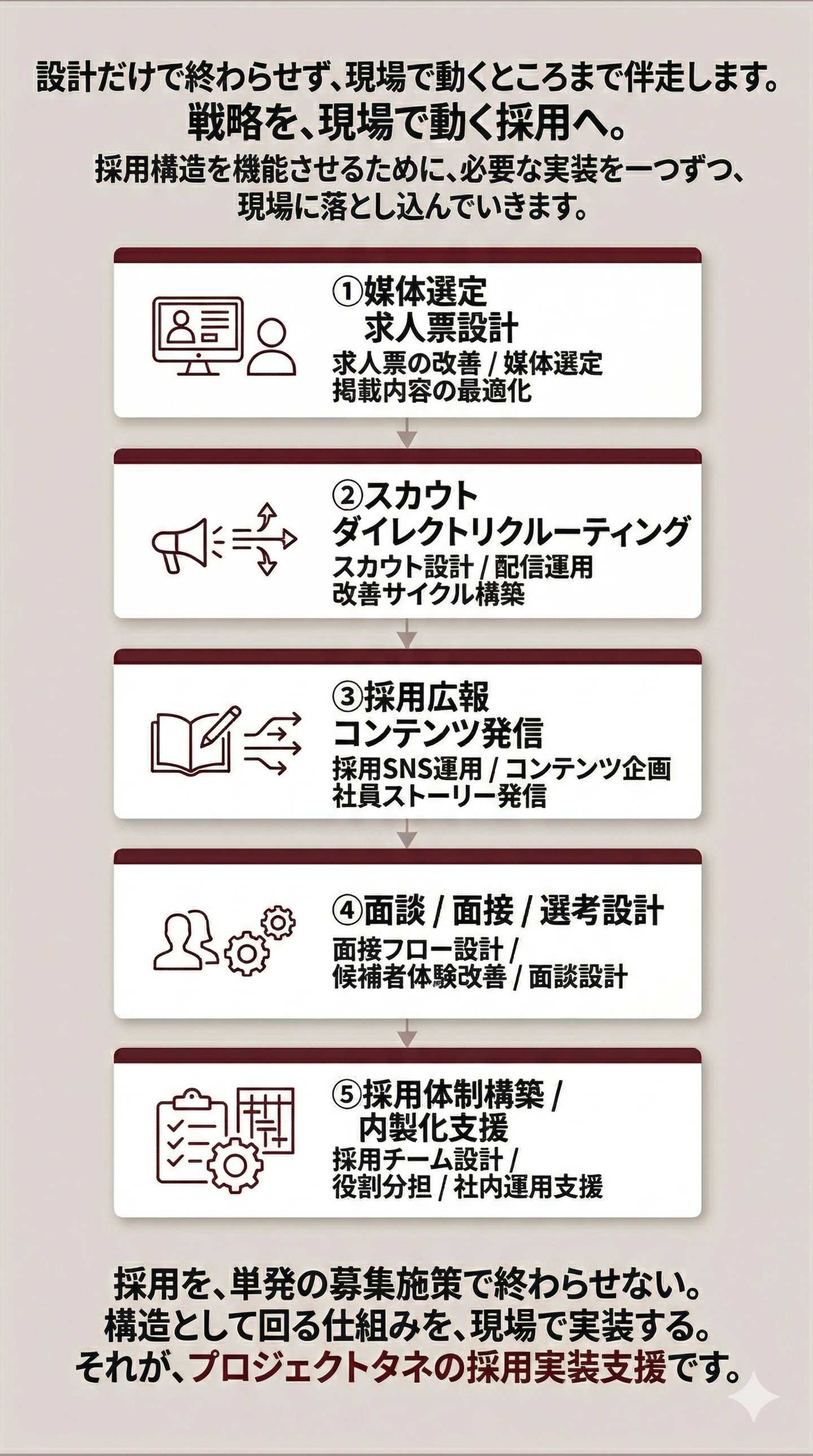 採用を、事業成長につながる構造として機能させるために、私たちは以下の要素を一体で整理・設計します。